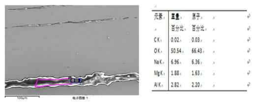 (1)含保护渣类复合夹杂,超长度(大于1mm)的塑性夹杂,为含保护渣(Si、Ca、Na成分)的复合夹杂,应为结晶器卷渣,见图4。